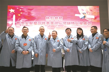 2月10日,在北京航天飞行控制中心指挥大厅,航天科研人员庆祝我国首次火星探测任务“天问一号”环绕火星成功。2021年2月10日19时52分,我国首次火星探测任务“天问一号”探测器实施近火捕获制动,成为我国第一颗人造火星卫星,实现“绕、着、巡”目标的第一步,环绕火星成功。新华社记者 金立旺 摄