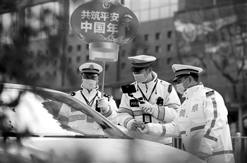 陕西省渭南市区朝阳大街中段,民警向驾乘电动车出行佩戴安全头盔的市民赠送“平安果”。近日,渭南市公安局交警支队在全市范围内开展“平安春运 交警同行 共筑平安中国年”主题宣传活动。他们以网络直播的方式开展“一盔一带”宣传,同时,向遵规守法的驾驶人赠送苹果,送去节日祝福。