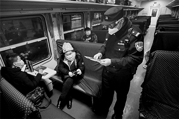 近日,由北京去往重庆西的3603次列车上,铁路民警正在为旅客宣传春运期间的安全知识,并为旅客送上爱民服务卡,随时为旅客提供服务,排忧解难。