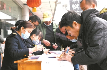 2月18日,在罗城汽车总站,赴粤务工农民工办理免费乘车手续。当日,广西壮族自治区罗城仫佬族自治县举行2021年返粤复工“点对点”免费输送活动启动仪式,活动期间,罗城籍赴广东务工和返岗务工的农民工均可享受免费乘车服务。 韦如代 摄/中新社