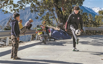 在藏东南边境小城墨脱县,16岁的门巴族少年旺前罗布是当地最耀眼的“球星”。2014年,他通过选拔进入恒大足球学校。今年回家,他发现有了新足球场——由广东佛山援藏力量支持建设的一块11人制足球场已接近完工。这块建在山崖边上的球场,是墨脱第一块标准的11人制足球场。这也是旺前罗布不敢想象的“新年礼物”。图为旺前罗布向弟弟们展示自己的球技(2月9日摄)。 新华社记者 罗博 摄