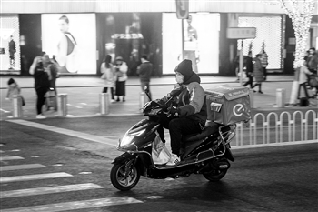 2月16日,北京一闹市区,外卖骑手正在进行派送。今年春节期间,不少人响应就地过年倡议,减少外出流动,“宅”经济愈发走俏,不少电商平台订单不断。与此同时,外卖骑手、快递员也成为最忙碌的人,为保证市民过个安心年奔波在大街小巷。 本报记者 王伟伟 摄
