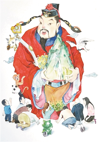 闫七郎没有让大家失望。在他的笔下,财神手里拿的已经不是人们熟悉的金银财宝,而是颇有气势的绿水青山以及由此引发的万千气象。看到此处,作者的诉求和期待水落石出——绿水青山,就是金山银山。