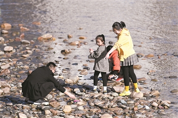 2月18日,市民带着孩子在黄河兰州段河床上游玩。