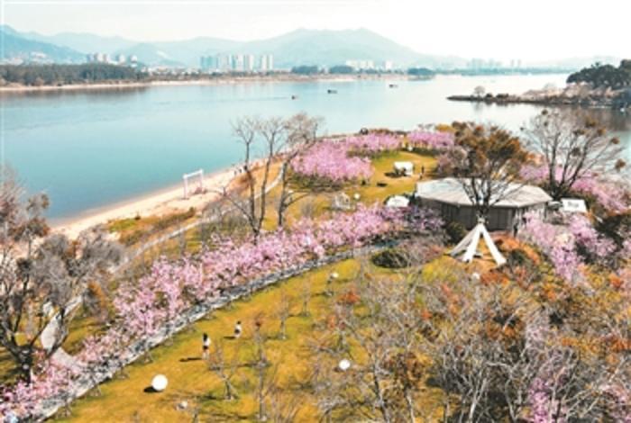 近日,位于福建省福州市闽侯县上街镇沙堤村的鲤鱼洲樱花岛上樱花陆续绽放,游客纷纷前来观花赏景,感受早春的气息。