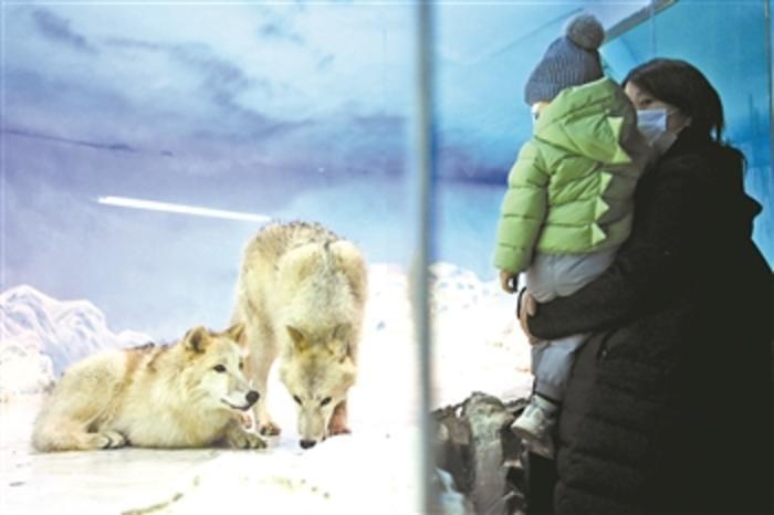 2月21日,游客在哈尔滨极地馆观赏北极狼。