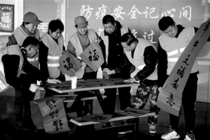写春联、看电影、演节目……这些都成为了中建一局北京城市副中心项目的工友们一起在生活区联欢过节的难忘记忆。该项目部为留京过年的工友提供免费食宿,精心策划活动,连续14天不间断,为工友们营造了喜庆祥和的节日氛围。图片摄于2月16日。本报记者 王伟伟 摄
