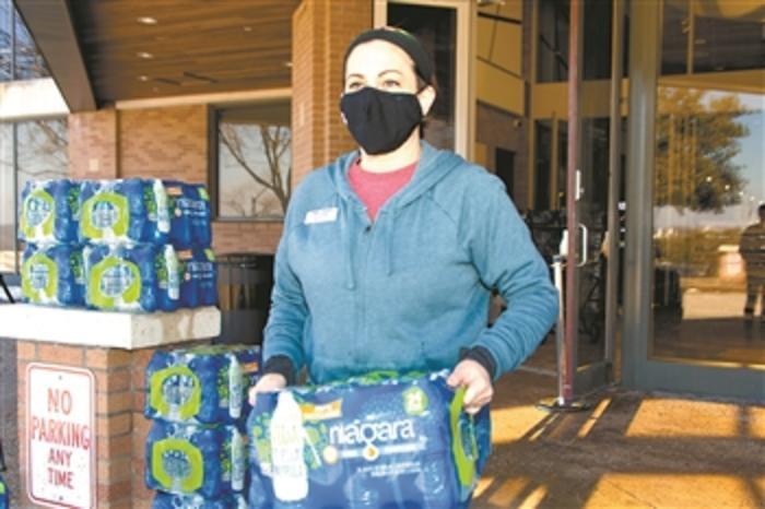 2月20日,在美国得克萨斯州普莱诺,工作人员为前来领取饮用水的市民送水。