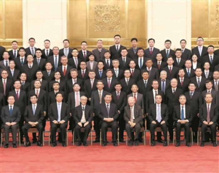 人民大会堂北大厅气氛喜庆热烈。上午10时许,习近平等党和国家领导同志步入会场,向参研参试人员代表挥手致意,全场响起经久不息的掌声。习近平同孙家栋、栾恩杰等亲切交流,并同大家合影留念。