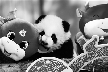 一只"2020级”熊猫宝宝向游客和全球熊猫爱好者拜年。新华社发