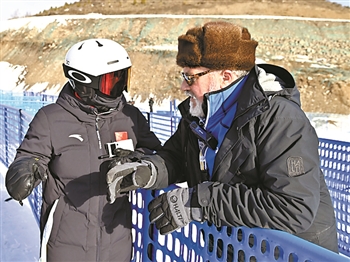 图为2月19日,国际雪联自由式滑雪协调官乔·菲茨杰拉德(右)在张家口赛区云顶滑雪场与工作人员交流混合区工作规范。新华社记者 贺长山 摄