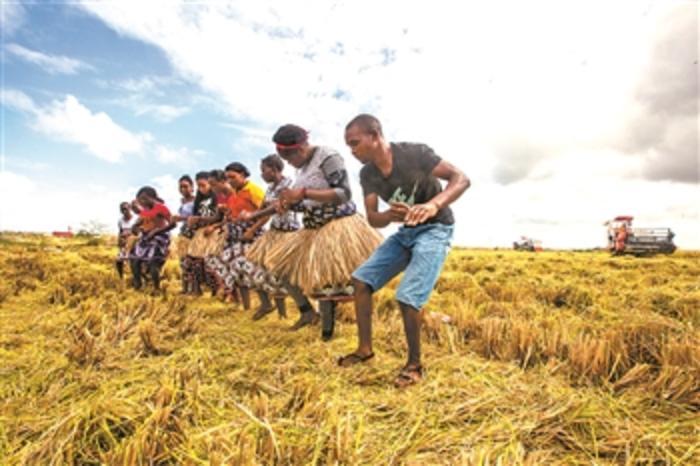 在莫桑比克万宝莫桑农业园,农户在水稻收割现场载歌载舞庆祝丰收。万宝莫桑农业园是中国在非洲最大规模水稻种植项目,极大地缓解了莫桑比克粮食短缺问题。新华社记者 张宇 摄