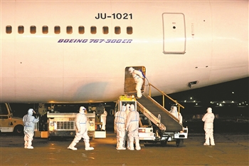 下图:2月23日凌晨,在蒙古国首都乌兰巴托成吉思汗国际机场,工作人员准备卸载中国援助的新冠疫苗。新华社记者 阿斯钢 摄