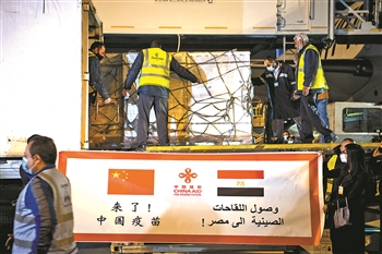 上图:2月23日,在埃及开罗国际机场,工作人员运输疫苗。中国援助埃及的首批新冠疫苗23日凌晨运抵开罗,援助阿盟秘书处的新冠疫苗也同机抵达。新华社记者 邬惠我 摄