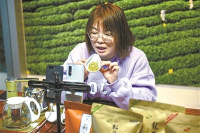 2月25日,在浙南茶叶市场的一家商铺内,主播叶玉珠向观众直播介绍茶叶。