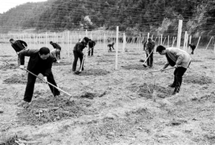 2月24日,在“十三五”国家级贫困村——江西省九江市修水县东港乡岭下村,中国铁路南昌局集团有限公司驻该村第一书记、工作队队长夏晖(左一)与果树种植专业人员带领当地农民正在种植猕猴桃苗木。