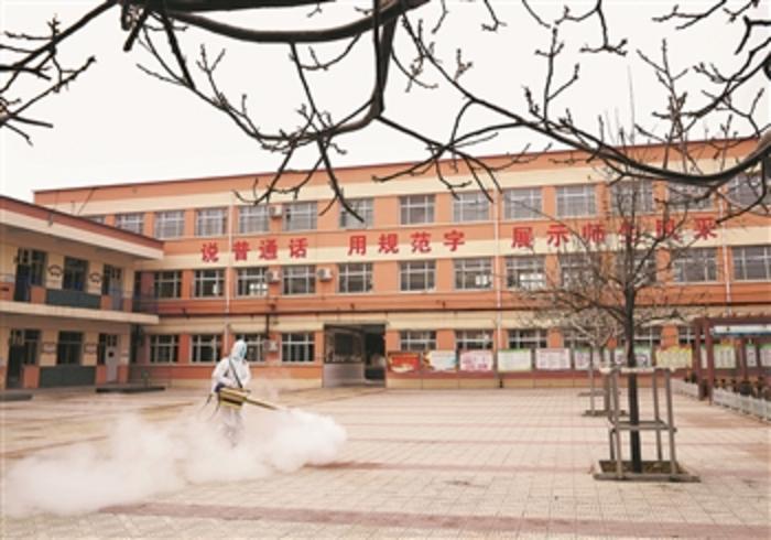 图为2月27日,在河北省邢台市内丘县实验小学,工作人员对校园进行消杀作业。