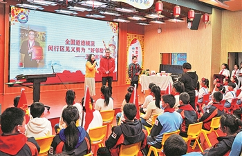 当日,上海闵行区航华第一小学举办“弘扬雷锋精神 感悟劳动价值”主题活动,邀请全国道德模范王海滨同学生分享从事志愿服务工作的心得,勉励学生积极参与志愿活动。 新华社记者 方喆 摄