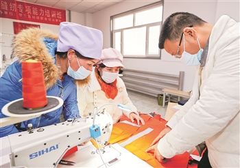 2月27日,宁夏灵武市郝家桥镇泾灵新村灵帼彩扶贫车间负责人徐江(右)在教女工缝纫袖子。泾灵新村是一个生态移民村,从2012年开始,陆续安置了从宁夏泾源县搬来的1686户7000余名群众。近年来,当地政府发展种植、服装加工等产业,让女性移民实现在家门口就业。 新华社记者 杨植森 摄