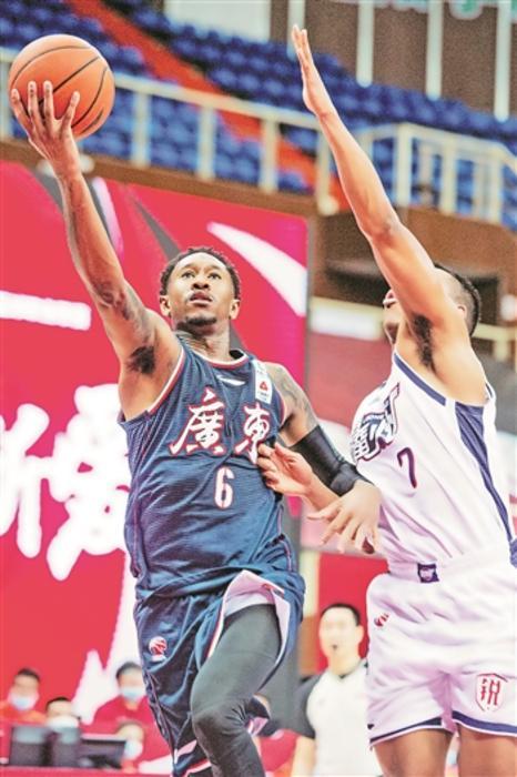 3月1日,广东东莞大益队球员布鲁克斯(左)在时代中国广州队球员祝铭震的防守下上篮。当日,在浙江诸暨举行的2020~2021赛季中国男子篮球职业联赛(CBA)第三阶段第40轮比赛中,广东东莞大益队以105比98战胜时代中国广州队。 新华社记者 江汉 摄