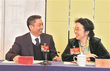3月4日上午,全国政协总工会界别十七组、十八组分别召开预备会议。会议结束后,许启金委员(左)和冯丹龙委员(右)继续讨论,意犹未尽。 孙承业 摄