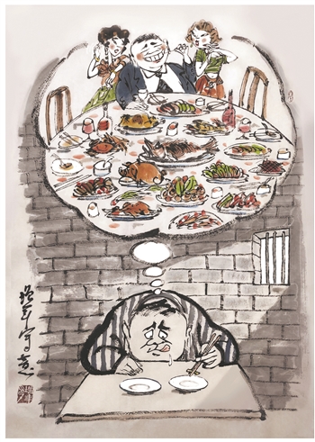 没有对比,就没有喜剧冲突;没有对比,就没有深刻反思;而有了这样的对比,我们还可以从中发现因果关系。看来,主人公今天的“窘境”,和他昔日“风光”有着千丝万缕的联系。这幅作品没有向我们交代主人公犯罪细节。漫画是重视情感的艺术,事实上,我们无须知道更多事实,作者的创作意图已经非常明确。贪污和浪费,都是对社会的巨大威胁。