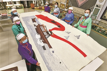 3月4日,在苏尼特左旗非物质文化遗产保护中心,8名绣娘展示尚未完成的作品《一叶红船映初心》。蒙古族刺绣是国家级非物质文化遗产,该作品以“南湖红船”为主题,计划于3月31日完成。