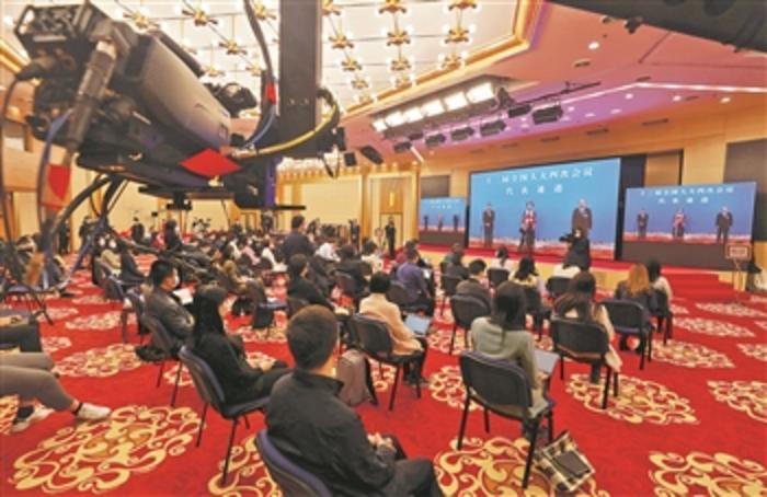 图①:记者在梅地亚新闻中心分会场和人民大会堂主会场的代表视频连线。