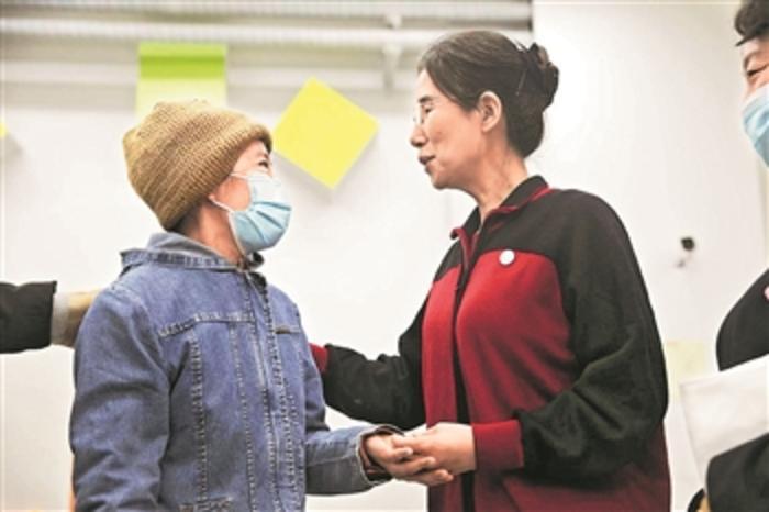 2月24日,北京,在科源社区,杨佳委员与一名残障职工沟通。本报记者 王伟伟 摄