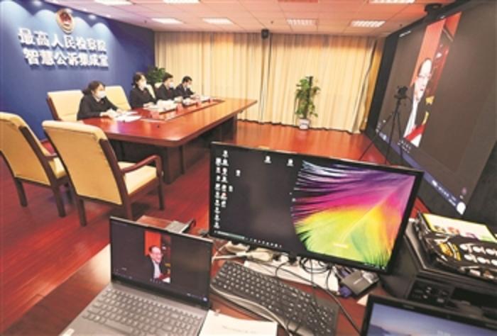 图为最高检有关人员通过网络视频形式旁听重庆代表团代表审议“两高”报告。