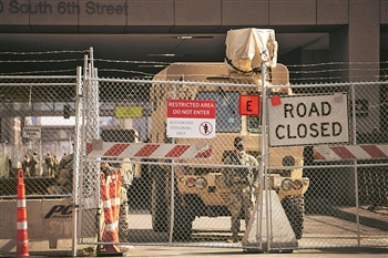 下图:3月9日,在美国明尼苏达州亨内平县负责审理弗洛伊德案的法院周围,国民警卫队封锁道路严阵以待。