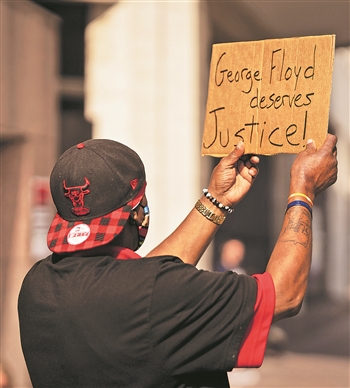 上图:3月9日,在美国明尼苏达州亨内平县负责审理弗洛伊德案的法院周围,示威者手举“弗洛伊德应当获得正义”的标语牌参加抗议活动。
