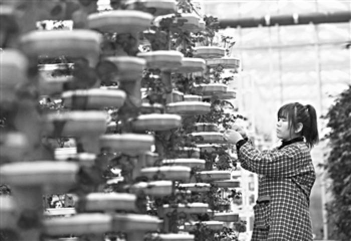 3月9日,在河北省曲周县一家创意农业园区,工人在管理立体无土栽培蔬菜。近年来,河北省邯郸市曲周县依托当地农业、旅游资源,打造“农旅融合”生态农业综合体,辐射带动农业增效、农民增收,为农村发展注入新活力,助力乡村振兴。
