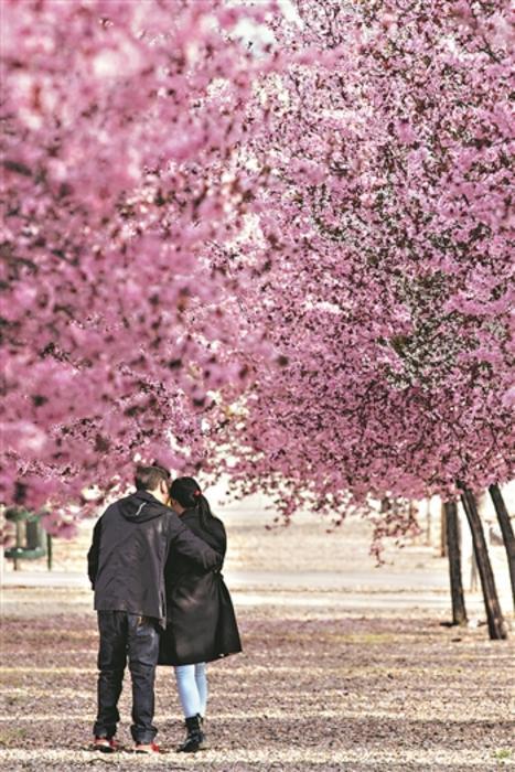 3月9日,游人漫步在西班牙马德里的胡安·卡洛斯一世公园内的樱花树下。新华社记者 孟鼎博 摄