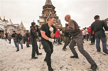 3月13日,在俄罗斯首都莫斯科,人们参加搏击活动庆祝谢肉节。