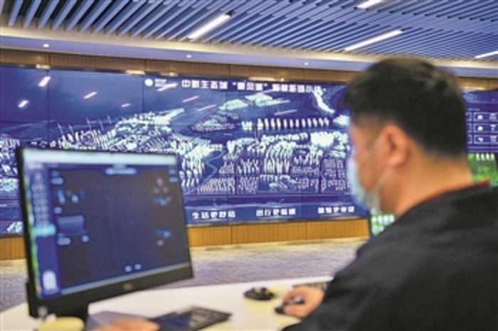 图为国网天津电力运维人员在天津中新生态城“惠风溪”智慧能源小镇监控大厅内监测设备运行情况。