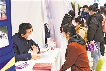 3月16日,一名求职毕业生在与用人单位招聘人员(左一)交流。当日,清华大学2021届毕业生大型就业洽谈会在清华大学学生职业发展指导中心启动,将有来自全国22个省市的300余家用人单位参会,提供8000余个招聘职位。 新华社记者 鞠焕宗 摄