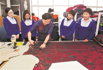 3月16日,河北省河间市一旗袍创意工坊的负责人为工人讲解旗袍加工制作技能。