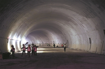 3月16日,施工人员在福州市工业北路文林山隧道内行走。