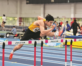3月13日,曾建航在男子60米栏决赛中。他以7秒55的成绩获得冠军。新华社记者 王曦 摄