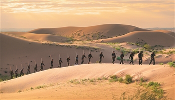 图为内蒙古鄂尔多斯市杭锦旗人武部组织干部职工和民兵深入库布其沙漠开展治沙绿化。