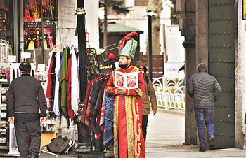 3月16日,土耳其伊斯坦布尔市区一家旅游纪念品商店的营业员在等待顾客。