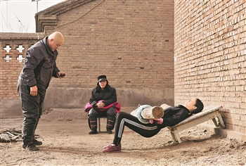 3月17日,郑国花在父亲郑龙的指导下进行体能训练。
