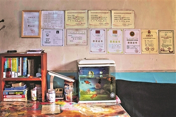 郑国花家的墙上张贴着自她参加田径比赛以来获得的部分奖状。