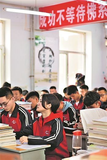3月17日下午,已经高二的郑国花与同学们一起在教室里听课。