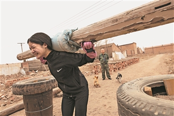 3月17日傍晚,内蒙古呼和浩特市土默特左旗,郑国花在家门口用父亲做的杠铃做蹲起训练。这些训练器械都是父亲用废旧材料改装的。