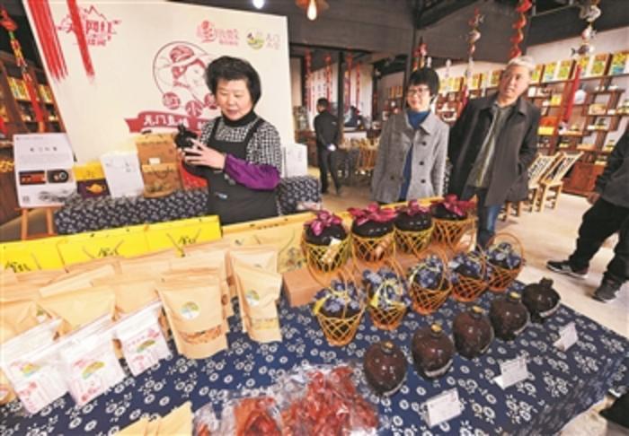 这是浙江杭州市临安区高虹镇龙门秘境村落景区内展示和销售特色农产品的旅游商店(3月22日摄)。