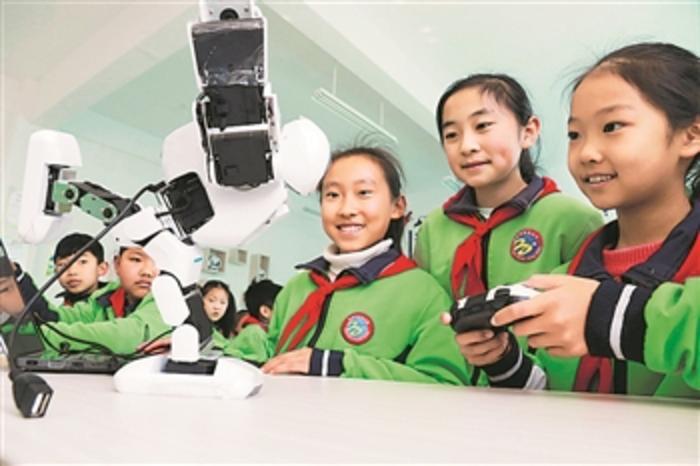 3月22日,山东省高密市北关小学的小学生在操作人形机器人。高密市北关小学积极打造智能学习教育环境,聘请专业的创客指导老师定期组织学生开展活动,激发小学生的创新意识。李海涛 摄/人民图片