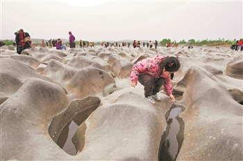 冬春枯水期,四川省涪江江油市青莲镇中河村段,约 5000 余平方米的石滩露出水面。石滩凹凸不平,好似起伏的山峦,每天吸引众多游人前来游玩。据专家解释,这种壶穴地貌景观是由涪江河床的基岩经水中裹挟的砾石长时间冲刷、磨蚀而成。