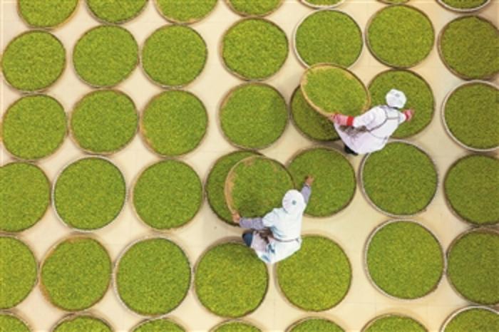 3月23日,在浙江景宁畲族自治县一茶叶加工企业,工人在摊青车间忙碌。